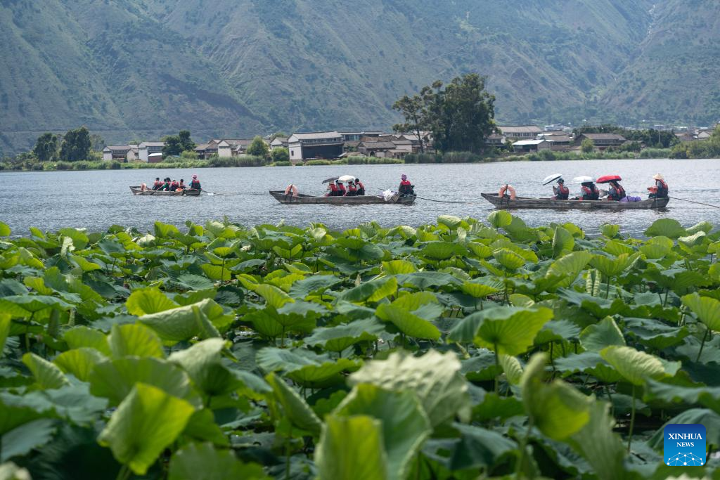 KUNMING, 12 julio, 2025 (Xinhua) -- Turistas navegan en botes, en la prefectura autónoma bai de Dali, en la provincia de Yunnan, en el suroeste de China, el 12 de julio de 2025. Los destinos turísticos en Yunnan entraron a su temporada alta de turismo con el comienzo de las vacaciones de verano. (Xinhua/Luo Xincai)