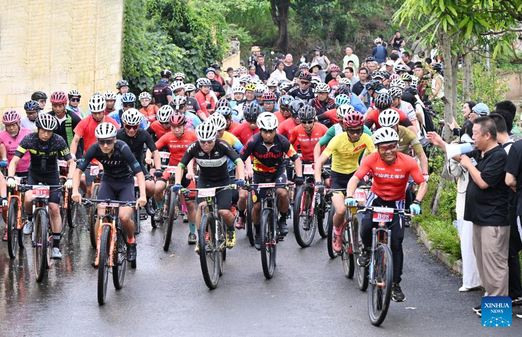 KUNMING, 12 julio, 2025 (Xinhua) -- Entusiastas asisten a una actividad de ciclismo, en la prefectura autónoma zhuang y miao de Wenshan, en la provincia de Yunnan, en el suroeste de China, el 12 de julio de 2025. Los destinos turísticos en Yunnan entraron a su temporada alta de turismo con el comienzo de las vacaciones de verano. (Xinhua/Xiong Pingxiang)