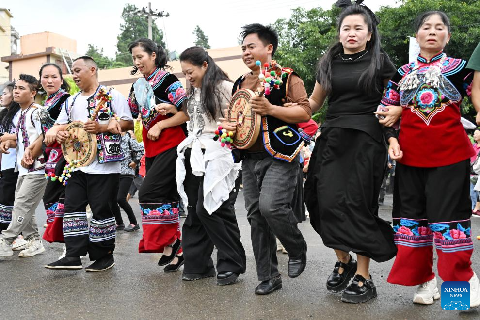 KUNMING, 12 julio, 2025 (Xinhua) -- Turistas bailan con residentes, en la prefectura autónoma zhuang y miao de Wenshan, en la provincia de Yunnan, en el suroeste de China, el 12 de julio de 2025. Los destinos turísticos en Yunnan entraron a su temporada alta de turismo con el comienzo de las vacaciones de verano. (Xinhua/Xiong Pingxiang)