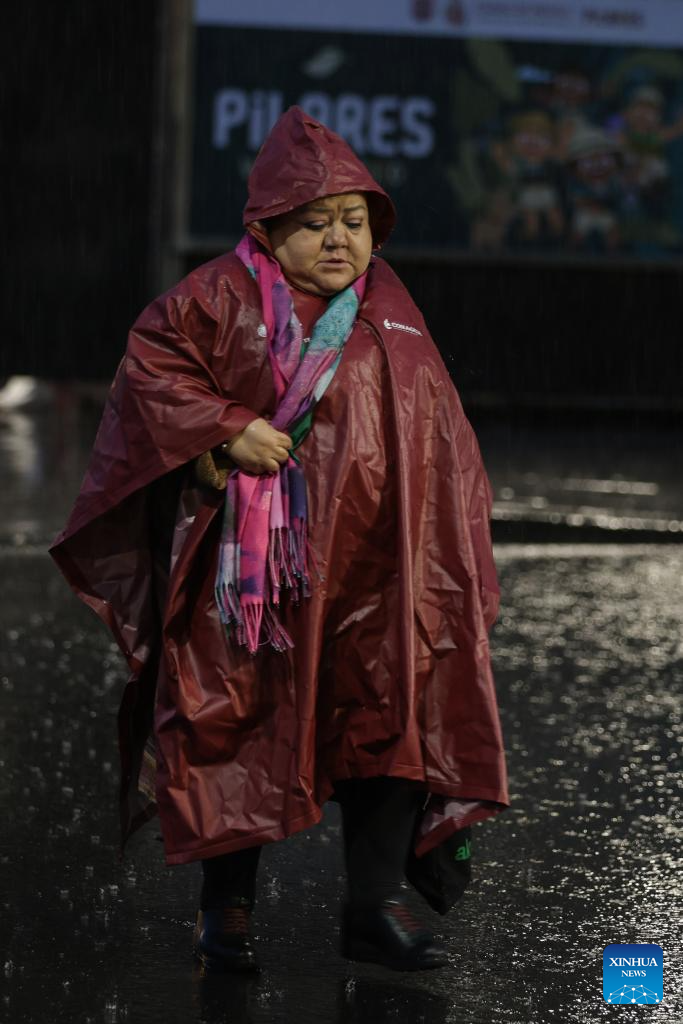 CIUDAD DE MEXICO, 12 julio, 2025 (Xinhua) -- Imagen del 11 de julio de 2025 de una mujer protegiéndose con un impermeable mientras camina bajo la lluvia, en la Ciudad de México, capital de México. (Xinhua/Francisco Cañedo)