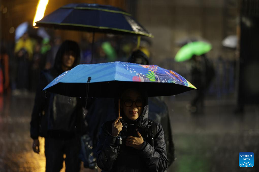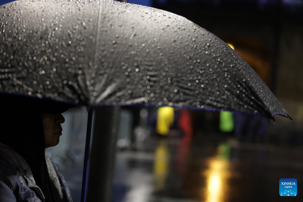 CIUDAD DE MEXICO, 12 julio, 2025 (Xinhua) -- Imagen del 11 de julio de 2025 de una persona protegiéndose con un paraguas mientras camina bajo la lluvia, en la Ciudad de México, capital de México. (Xinhua/Francisco Cañedo)
