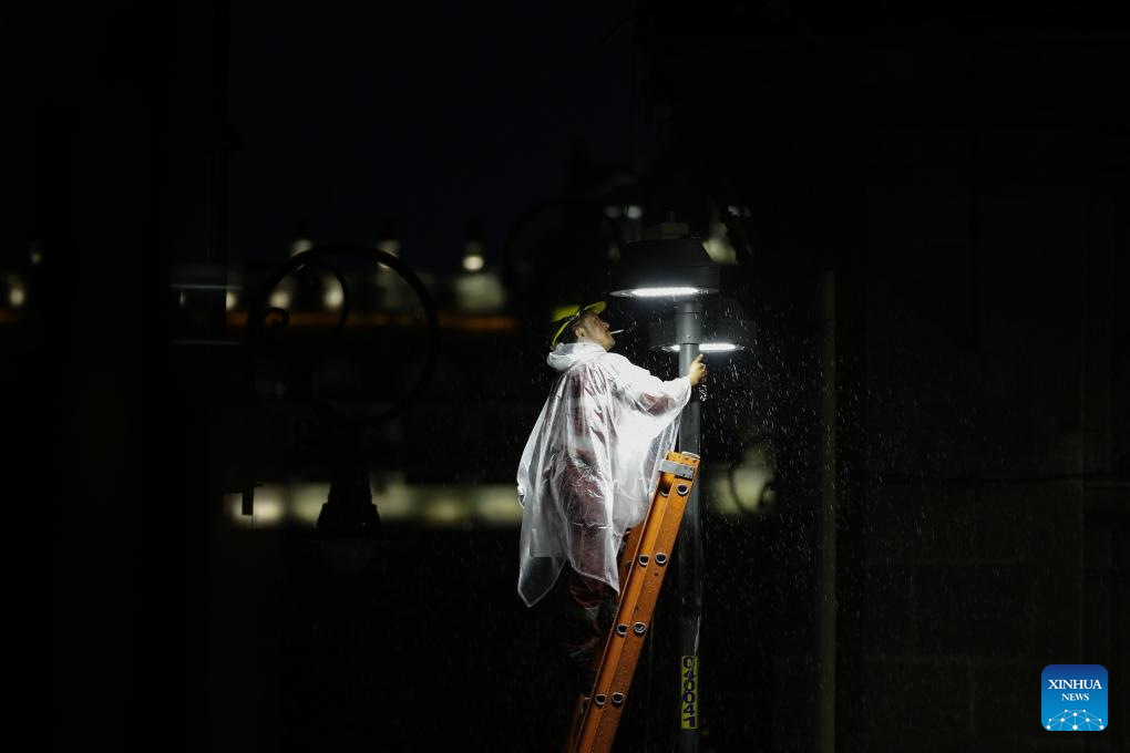 CIUDAD DE MEXICO, 12 julio, 2025 (Xinhua) -- Imagen del 11 de julio de 2025 de un hombre realizando una reparación del alumbrado público bajo la lluvia, en la Ciudad de México, capital de México. (Xinhua/Francisco Cañedo)
