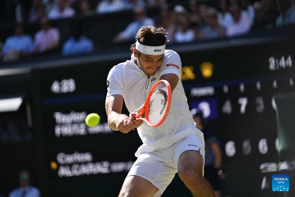LONDRES, 12 julio, 2025 (Xinhua) -- Imagen del 11 de julio de 2025 de Taylor Fritz devolviendo la pelota durante el partido de semifinal de individuales masculinos entre Carlos Alcaraz, de España, y Taylor Fritz, de Estados Unidos, en el Campeonato de Tenis de Wimbledon, en Londres, Reino Unido. (Xinhua/Zhao Dingzhe)