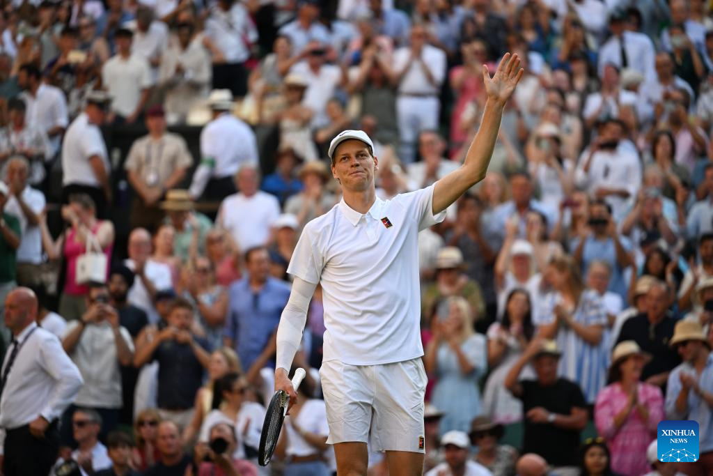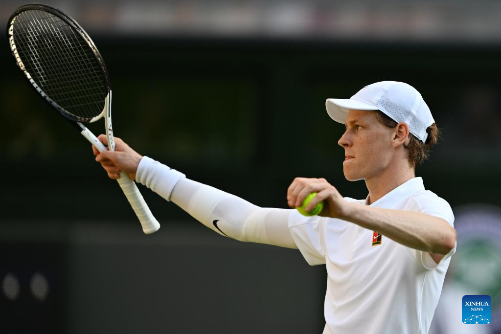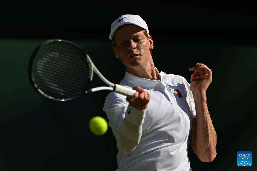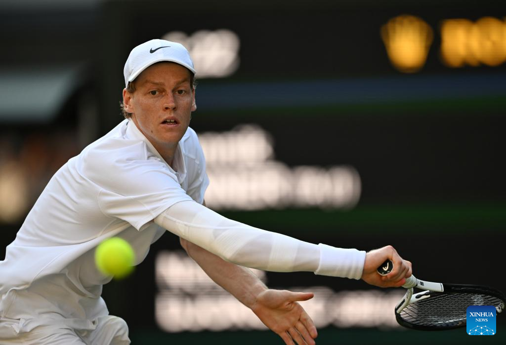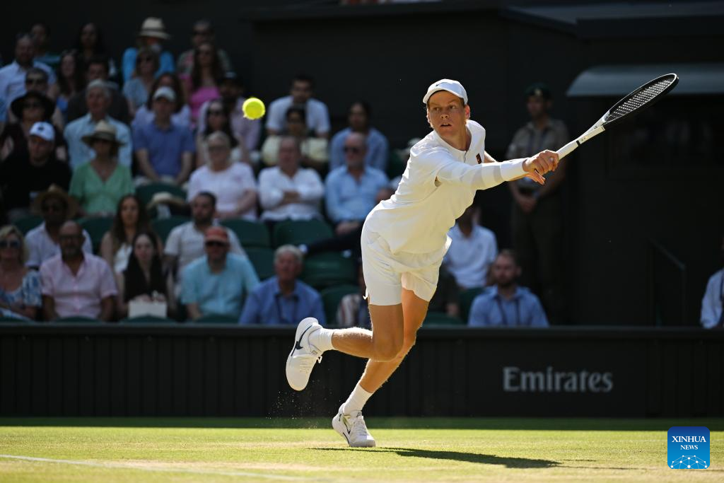 LONDRES, 12 julio, 2025 (Xinhua) -- Imagen del 11 de julio de 2025 de Jannik Sinner devolviendo la pelota durante el partido de semifinal de individuales masculinos entre Jannik Sinner, de Italia, y Novak Djokovic, de Serbia, en el Campeonato de Tenis de Wimbledon, en Londres, Reino Unido. (Xinhua/Zhao Dingzhe)