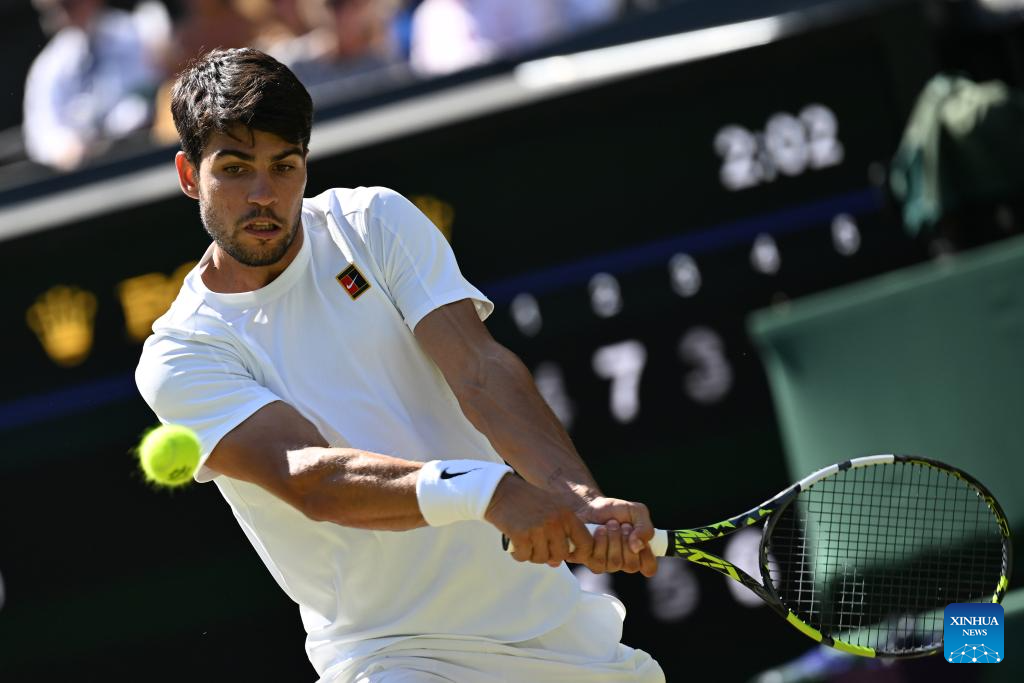 LONDRES, 12 julio, 2025 (Xinhua) -- Imagen del 11 de julio de 2025 de Carlos Alcaraz devolviendo la pelota durante el partido de semifinal de individuales masculinos entre Carlos Alcaraz, de España, y Taylor Fritz, de Estados Unidos, en el Campeonato de Tenis de Wimbledon, en Londres, Reino Unido. (Xinhua/Zhao Dingzhe)