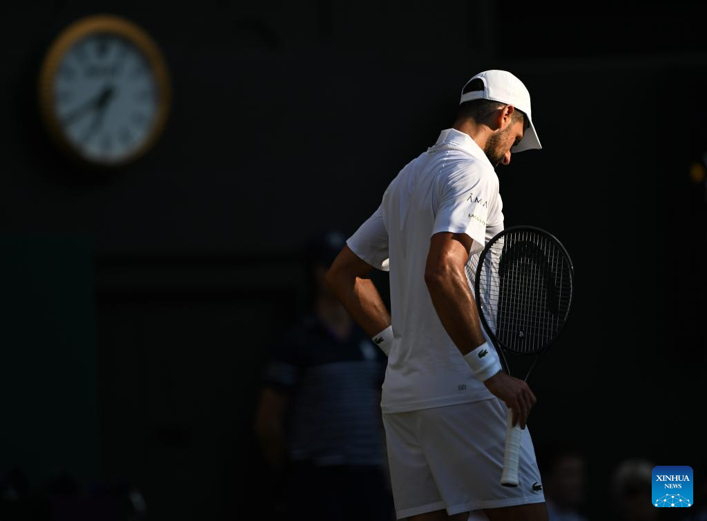 LONDRES, 12 julio, 2025 (Xinhua) -- Imagen del 11 de julio de 2025 de Novak Djokovic reaccionando durante el partido de semifinal de individuales masculinos entre Jannik Sinner, de Italia, y Novak Djokovic, de Serbia, en el Campeonato de Tenis de Wimbledon, en Londres, Reino Unido. (Xinhua/Zhao Dingzhe)