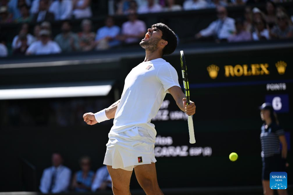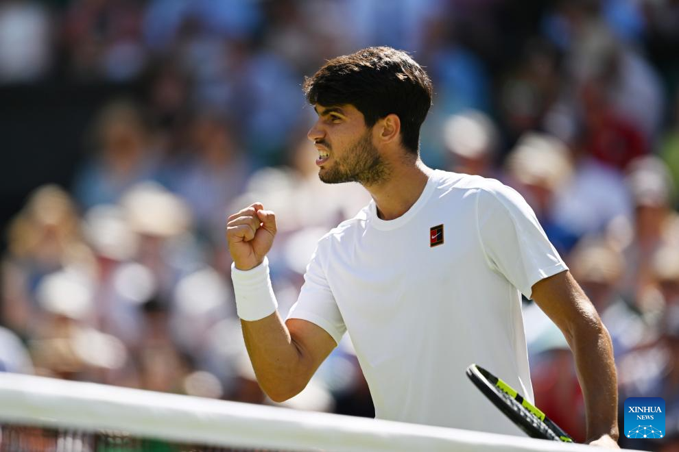 LONDRES, 12 julio, 2025 (Xinhua) -- Imagen del 11 de julio de 2025 de Carlos Alcaraz festejando al ganar el partido de semifinal de individuales masculinos entre Carlos Alcaraz, de España, y Taylor Fritz, de Estados Unidos, en el Campeonato de Tenis de Wimbledon, en Londres, Reino Unido. (Xinhua/Zhao Dingzhe)