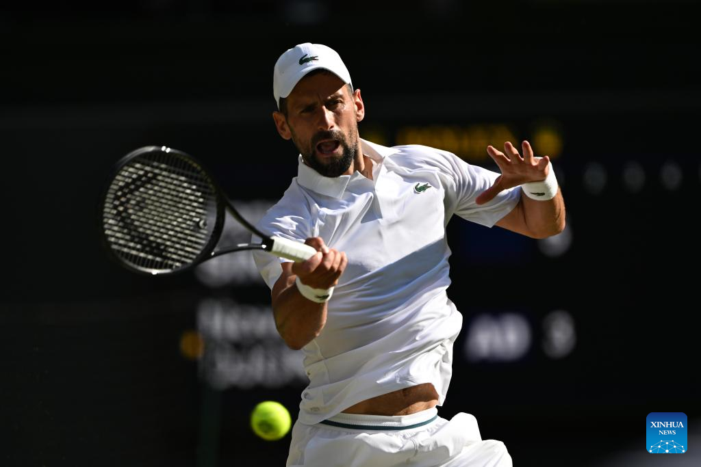 LONDRES, 12 julio, 2025 (Xinhua) -- Imagen del 11 de julio de 2025 de Novak Djokovic devolviendo la pelota durante el partido de semifinal de individuales masculinos entre Jannik Sinner, de Italia, y Novak Djokovic, de Serbia, en el Campeonato de Tenis de Wimbledon, en Londres, Reino Unido. (Xinhua/Zhao Dingzhe)
