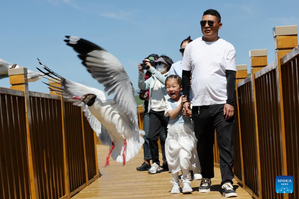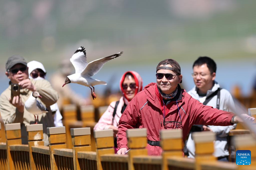 LUQU, 12 julio, 2025 (Xinhua) -- Imagen del 11 de julio de 2025 de turistas observando gaviotas de cabeza marrón en el humedal de Gahai, en el distrito de Luqu de la prefectura autónoma tibetana de Gannan, en la provincia de Gansu, en el noroeste de China. Las aviotas de cabeza marrón en el humedal de Gahai atraen a muchos turistas en verano. (Xinhua/Chen Bin)