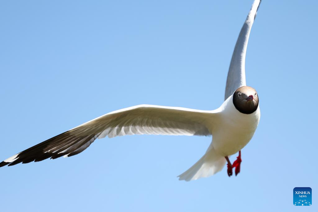 LUQU, 12 julio, 2025 (Xinhua) -- Imagen del 11 de julio de 2025 de una gaviota de cabeza marrón volando sobre el humedal de Gahai, en el distrito de Luqu de la prefectura autónoma tibetana de Gannan, en la provincia de Gansu, en el noroeste de China. Las aviotas de cabeza marrón en el humedal de Gahai atraen a muchos turistas en verano. (Xinhua/Chen Bin)