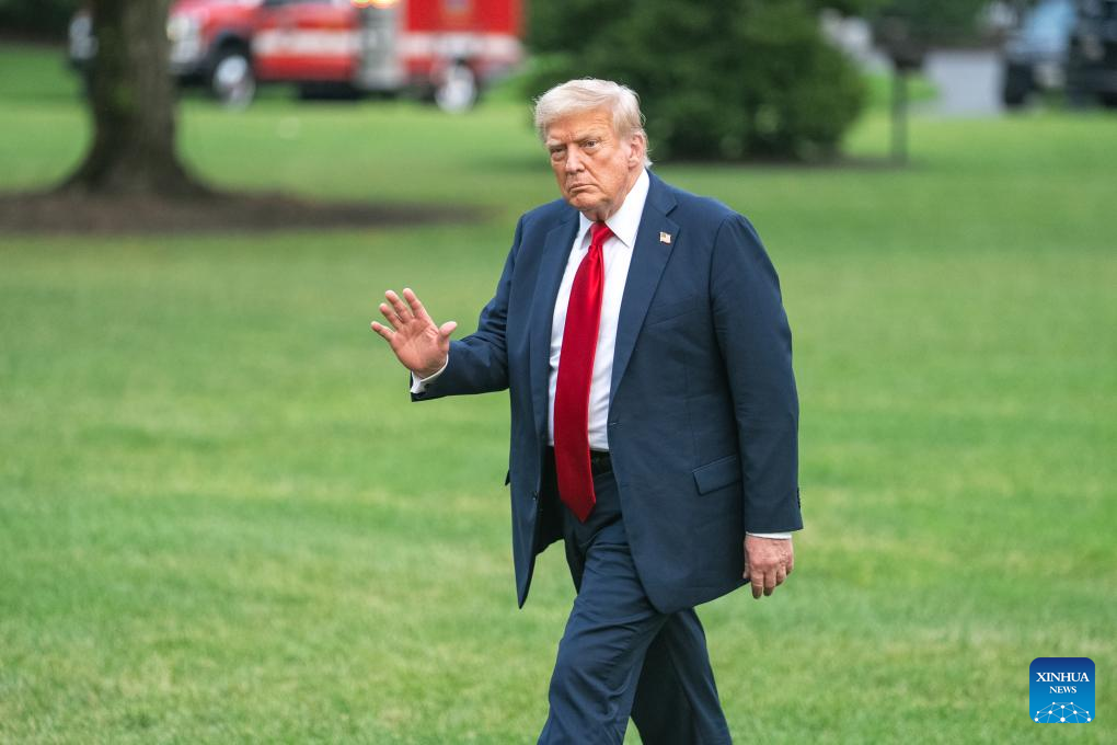 WASHINGTON, 14 julio, 2025 (Xinhua) -- Imagen del 13 de julio de 2025 del presidente estadounidense, Donald Trump, gesticulando a su regreso a la Casa Blanca, en Washington D.C., Estados Unidos. Trump dijo el domingo que Estados Unidos enviará sistemas de misiles interceptores Patriot a Ucrania para ayudar a reforzar las defensas del país contra los ataques rusos. (Xinhua/Hu Yousong)