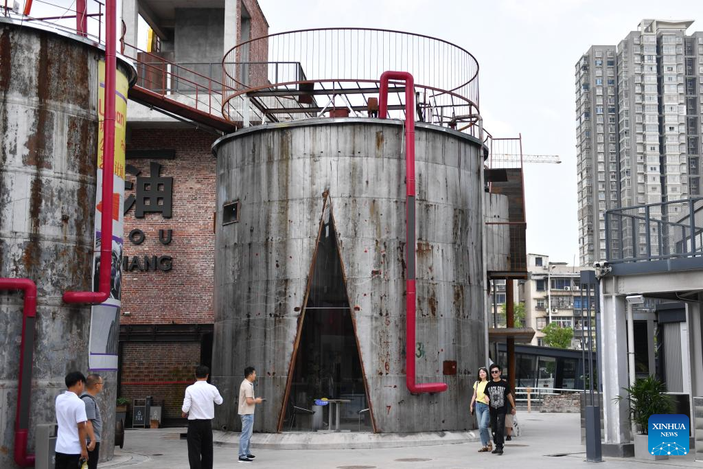 CHANGSHA, 13 julio, 2025 (Xinhua) -- Personas recorren un depósito de petróleo obsoleto, en Changsha, en la provincia de Hunan, en el centro de China, el 13 de julio de 2025. En el distrito de Tianxin de la ciudad de Changsha, se alzan doce tanques de petróleo desgastados a lo largo del río Xiangjiang. Este sitio sirvió antiguamente como depósito de petróleo para la ciudad, testigo de una época en la que los ciudadanos obtenían aceite comestible con cupones de racionamiento. La instalación permaneció prácticamente sin uso desde la década de 1990. En julio de este año se reabrió este patrimonio industrial, con tanques de petróleo e instalaciones auxiliares transformados en vibrantes cafeterías, salas de exposiciones, tiendas de arte, entre otros, que combinan diseño industrial y diversas experiencias de consumo que atraen tanto a residentes como a turistas. (Xinhua/Chen Zhenhai)