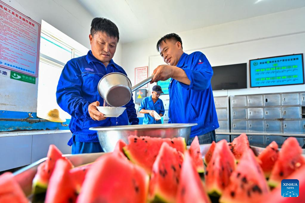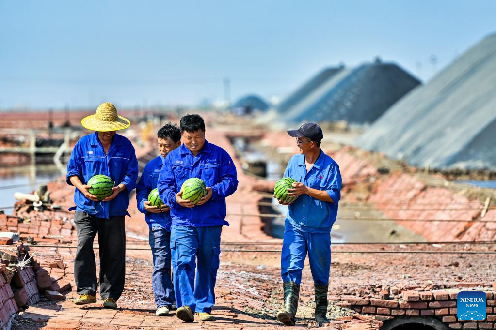 BEIJING, 13 julio, 2025 (Xinhua) -- Trabajadores reclaman sandías como refrescante de verano en un campo de sal, en la municipalidad de Tianjin, en el norte de China, el 13 de julio de 2025. Una ola de calor está azotando múltiples regiones de China, lo que ha llevado a las autoridades a implementar medidas para garantizar la seguridad laboral y una producción estable. (Xinhua/Du Penghui)