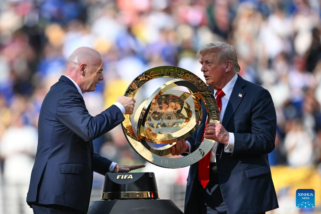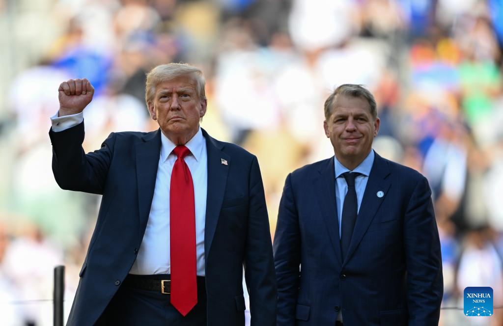 NUEVA JERSEY, 14 julio, 2025 (Xinhua) -- Imagen del 13 de julio de 2025 del presidente estadounidense, Donald Trump (i), asistiendo a la ceremonia de premiación del partido final entre Chelsea FC, de Inglaterra, y Paris Saint-Germain, de Francia, en la Copa Mundial de Clubes de la FIFA 2025, en el MetLife Stadium, en Nueva Jersey, Estados Unidos. (Xinhua/Wu Xiaoling)