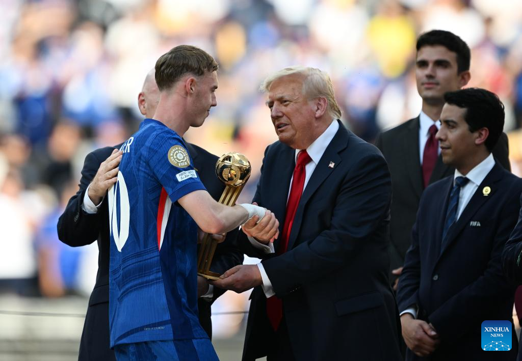 NUEVA JERSEY, 14 julio, 2025 (Xinhua) -- Imagen del 13 de julio de 2025 de presidente estadounidense, Donald Trump (d-frente), premiando a Cole Palmer (i-frente), de Chelsea FC, con el trofeo balón de oro, durante la ceremonia de premiación del partido final entre Chelsea FC, de Inglaterra, y Paris Saint-Germain, de Francia, en la Copa Mundial de Clubes de la FIFA 2025, en el MetLife Stadium, en Nueva Jersey, Estados Unidos. (Xinhua/Wu Xiaoling)