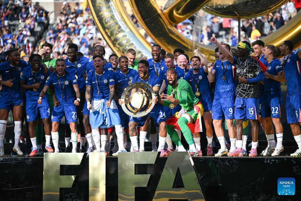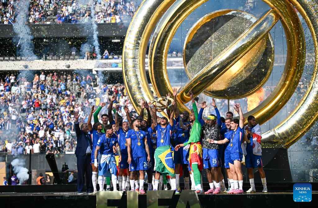 NUEVA JERSEY, 14 julio, 2025 (Xinhua) -- Imagen del 13 de julio de 2025 del equipo Chelsea FC festejando durante la ceremonia de premiación del partido final entre Chelsea FC, de Inglaterra, y Paris Saint-Germain, de Francia, en la Copa Mundial de Clubes de la FIFA 2025, en el MetLife Stadium, en Nueva Jersey, Estados Unidos. (Xinhua/Wu Xiaoling)