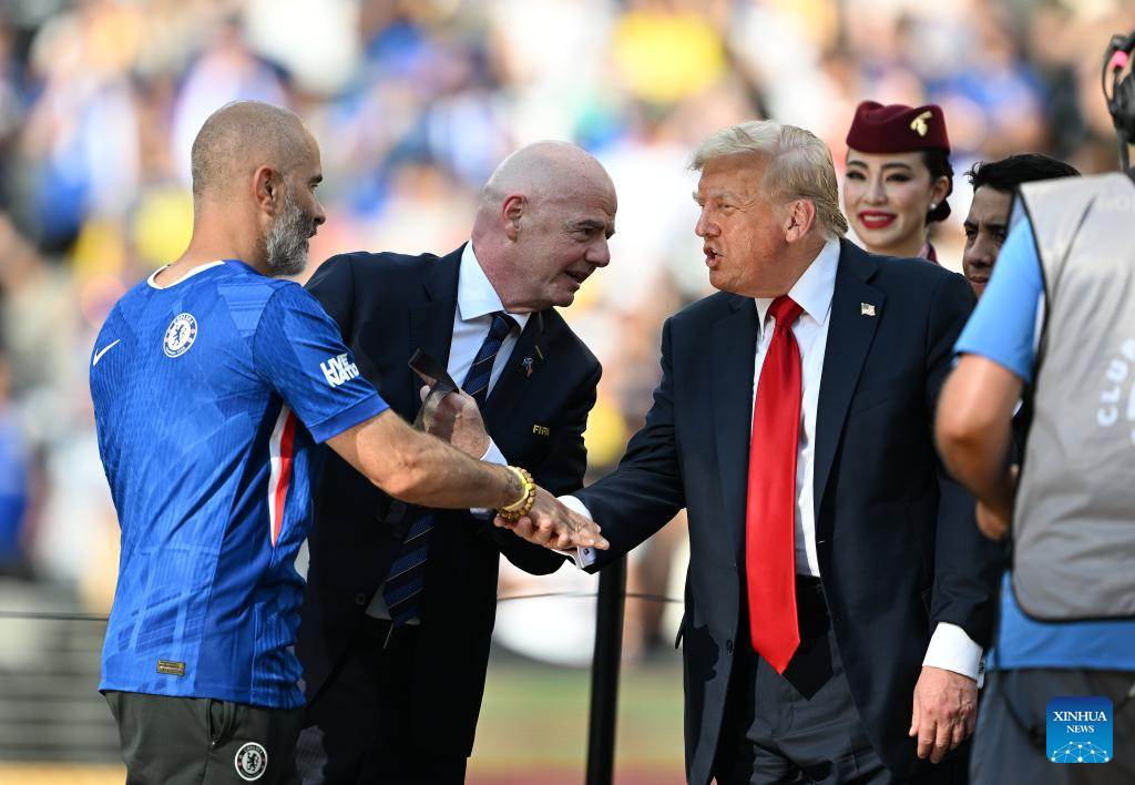 NUEVA JERSEY, 14 julio, 2025 (Xinhua) -- Imagen del 13 de julio de 2025 del presidente estadounidense, Donald Trump (c), saludando a Enzo Maresca (i), director técnico de Chelsea FC, durante la ceremonia de premiación del partido final entre Chelsea FC, de Inglaterra, y Paris Saint-Germain, de Francia, en la Copa Mundial de Clubes de la FIFA 2025, en el MetLife Stadium, en Nueva Jersey, Estados Unidos. (Xinhua/Wu Xiaoling)