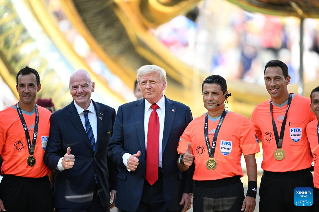 NUEVA JERSEY, 14 julio, 2025 (Xinhua) -- Imagen del 13 de julio de 2025 del presidente estadounidense, Donald Trump (c), y los árbitros posando para fotografías durante la ceremonia de premiación del partido final entre Chelsea FC, de Inglaterra, y Paris Saint-Germain, de Francia, en la Copa Mundial de Clubes de la FIFA 2025, en el MetLife Stadium, en Nueva Jersey, Estados Unidos. (Xinhua/Wu Xiaoling)