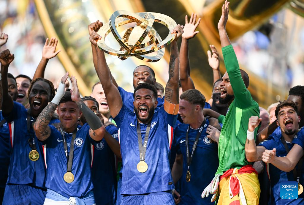 NUEVA JERSEY, 14 julio, 2025 (Xinhua) -- Imagen del 13 de julio de 2025 de Reece James (c), de Chelsea, sosteniendo el trofeo con sus compañeros durante la ceremonia de premiación del partido final entre Chelsea FC, de Inglaterra, y Paris Saint-Germain, de Francia, en la Copa Mundial de Clubes de la FIFA 2025, en el MetLife Stadium, en Nueva Jersey, Estados Unidos. (Xinhua/Wu Xiaoling)