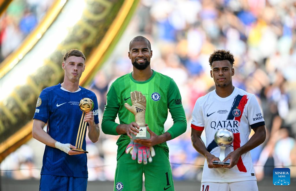 NUEVA JERSEY, 14 julio, 2025 (Xinhua) -- Imagen del 13 de julio de 2025 de Cole Palmer (i), de Chelsea FC, con el trofeo balón de oro, Desire Doue (d), de Paris Saint-Germain, con el premio al Jugador Joven del Año, y Robert Sánchez, de Chelsea FC, con el trofeo Guante de Oro, posando para fotografías durante la ceremonia de premiación del partido final entre Chelsea FC, de Inglaterra, y Paris Saint-Germain, de Francia, en la Copa Mundial de Clubes de la FIFA 2025, en el MetLife Stadium, en Nueva Jersey, Estados Unidos. (Xinhua/Wu Xiaoling)
