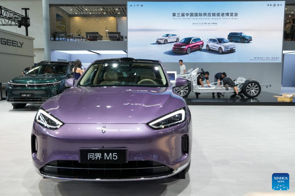 BEIJING, 14 julio, 2025 (Xinhua) -- Imagen del 14 de julio de 2025 de un vehículo AITO M5 en la sección de vehículos inteligentes de la próxima tercera Exposición Internacional de la Cadena de Suministro de China (CISCE, por sus siglas en inglés), en Beijing, capital de China. La tercera CISCE, tendrá lugar en Beijing del 16 al 20 de julio y se espera que se enfoque en cadenas de suministro de manufactura avanzada, energía limpia, vehículos inteligentes, tecnología digital, vida saludable y agricultura verde. (Xinhua/Ju Huanzong)