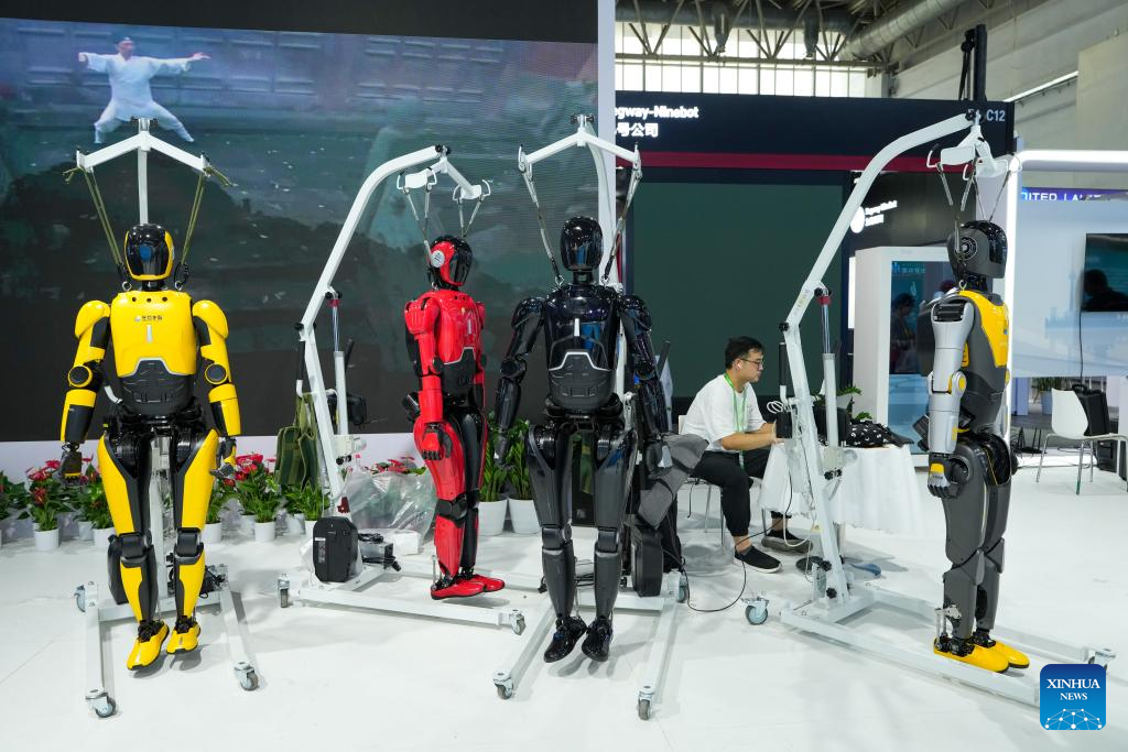 BEIJING, 14 julio, 2025 (Xinhua) -- Un empleado trabaja en un área de exposiciones para la cadena industrial de robots humanoides de la provincia de Hubei en la sección de tecnología digital de la próxima tercera Exposición Internacional de la Cadena de Suministro de China (CISCE, por sus siglas en inglés), en Beijing, capital de China, el 14 de julio de 2025. La tercera CISCE, tendrá lugar en Beijing del 16 al 20 de julio y se espera que se enfoque en cadenas de suministro de manufactura avanzada, energía limpia, vehículos inteligentes, tecnología digital, vida saludable y agricultura verde. (Xinhua/Ju Huanzong)