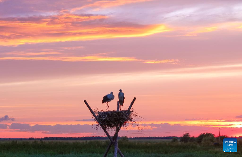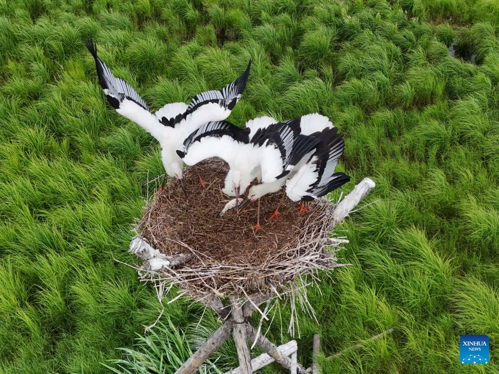 FUJIN, 14 julio, 2025 (Xinhua) -- Imagen tomada con un dron el 13 de julio de 2025 de cigüeñas blancas orientales en un nido artificial en la Reserva Natural Nacional de Sanhuanpao, en la ciudad de Fujin, en la provincia de Heilongjiang, en el noreste de China. El solsticio de verano es la época típica de emplumamiento para los polluelos de cigüeña blanca oriental, que posteriormente abandonarán a sus padres. Esta especie goza de protección nacional de primera clase en China. Cada primavera, migran desde los tramos medio e inferior del río Yangtze a sus hábitats de reproducción en el noreste de China. (Xinhua/Qu Yubao)