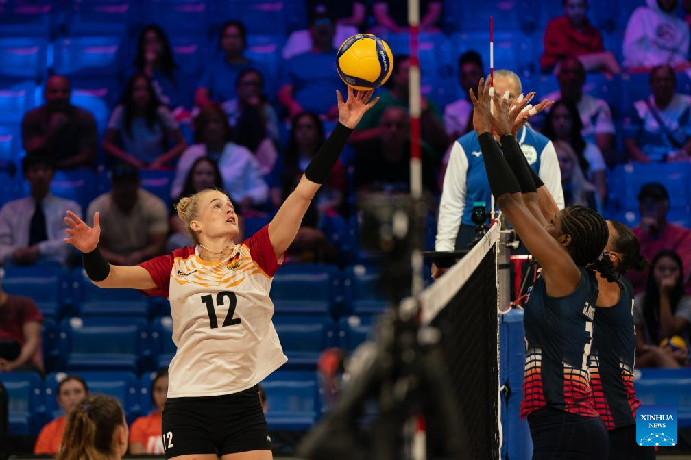 ARLINGTON, 14 julio, 2025 (Xinhua) -- Imagen del 13 de julio de 2025 de Hanna Orthmann (i), de Alemania, golpeando el balón durante el partido del grupo 8 entre Alemania y República Dominicana en la Liga de Naciones de Voleibol Femenino 2025, en Arlington, Estados Unidos. (Xinhua/Chen Chen)