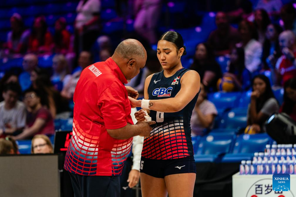 ARLINGTON, 14 julio, 2025 (Xinhua) -- Imagen del 13 de julio de 2025 de Ariana Rodríguez Fung (d), de República Dominicana, recibiendo atención médica durante el partido del grupo 8 entre Alemania y República Dominicana en la Liga de Naciones de Voleibol Femenino 2025, en Arlington, Estados Unidos. (Xinhua/Chen Chen)