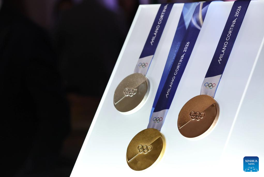VENECIA, 15 julio, 2025 (Xinhua) -- Las medallas de los Juegos Olímpicos de Invierno Milano Cortina 2026 se exhiben durante la ceremonia de presentación en el Palacio Balbi, en Venecia, Italia, el 15 de julio de 2025. (Xinhua/Li Jing)