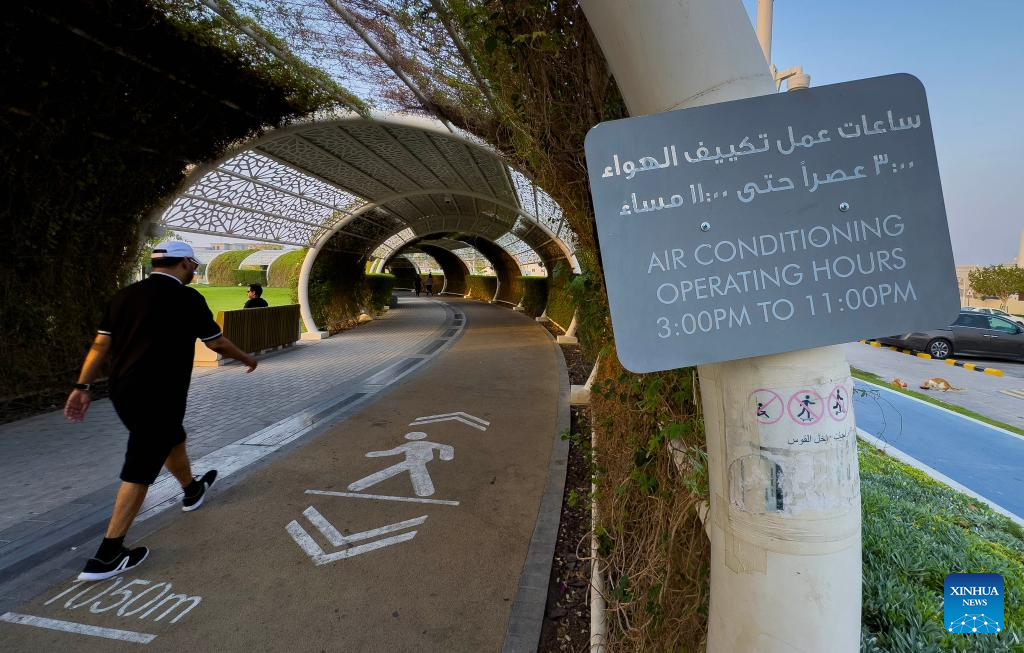 DOHA, 15 julio, 2025 (Xinhua) -- Imagen del 13 de julio de 2025 de un hombre caminando por un sendero al aire libre con aire acondicionado en el Parque Umm Al Seneem, en Doha, Qatar. En los últimos años, Qatar ha comenzado a integrar estrategias de refrigeración en su planificación urbana, transformando la infraestructura de la ciudad en un experimento de gran alcance para mantener la habitabilidad bajo temperaturas extremas. Un ejemplo destacado es el Parque Umm Al Seneem, que alberga una de las pistas para caminar y correr al aire libre con aire acondicionado más largas del mundo. (Xinhua/Nikku)