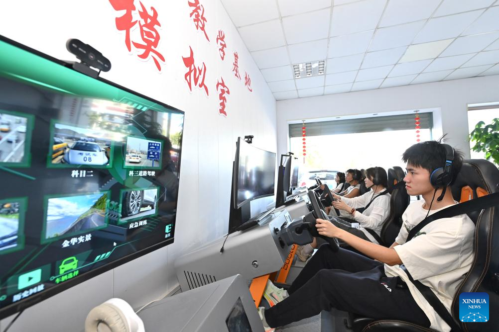DONGYANG, 15 julio, 2025 (Xinhua) -- Imagen del 2 de julio de 2025 de aprendices practicando la conducción con simuladores de conducción en interior en la escuela de conducción Xinlong, en Dongyang, en la provincia de Zhejiang, en el este de China. La escuela de conducción ha introducido un sistema de enseñanza asistido por IA, que incluye vehículos de formación con IA, simuladores de conducción en interiores y un sistema de gestión de datos impulsado por IA. (Xinhua/Bao Kangxuan)