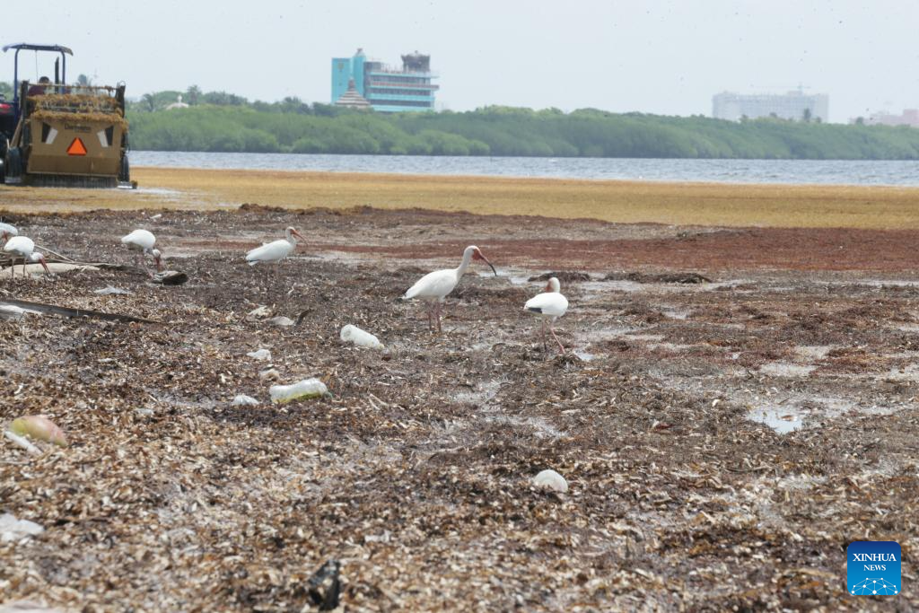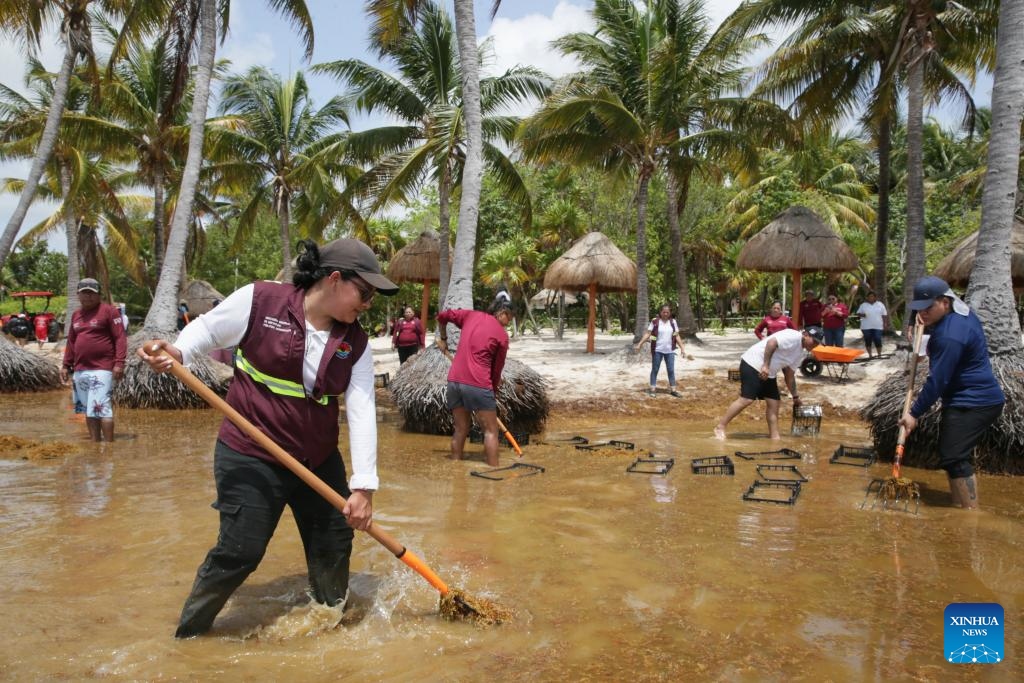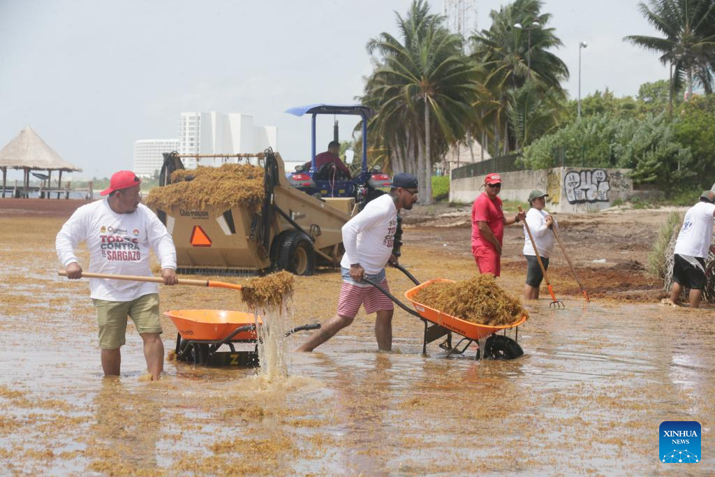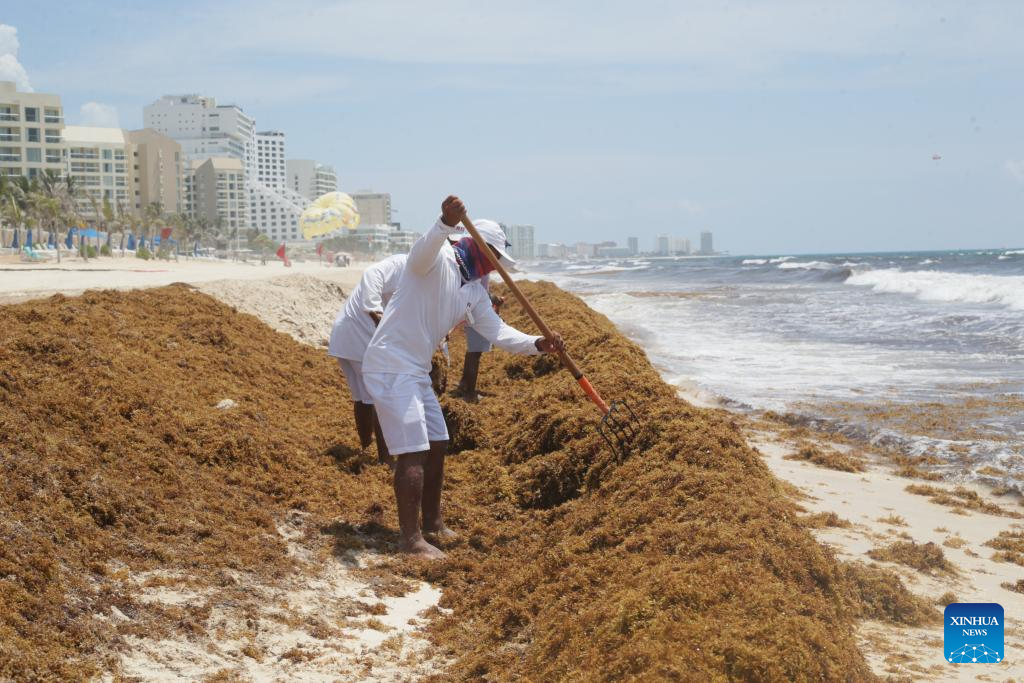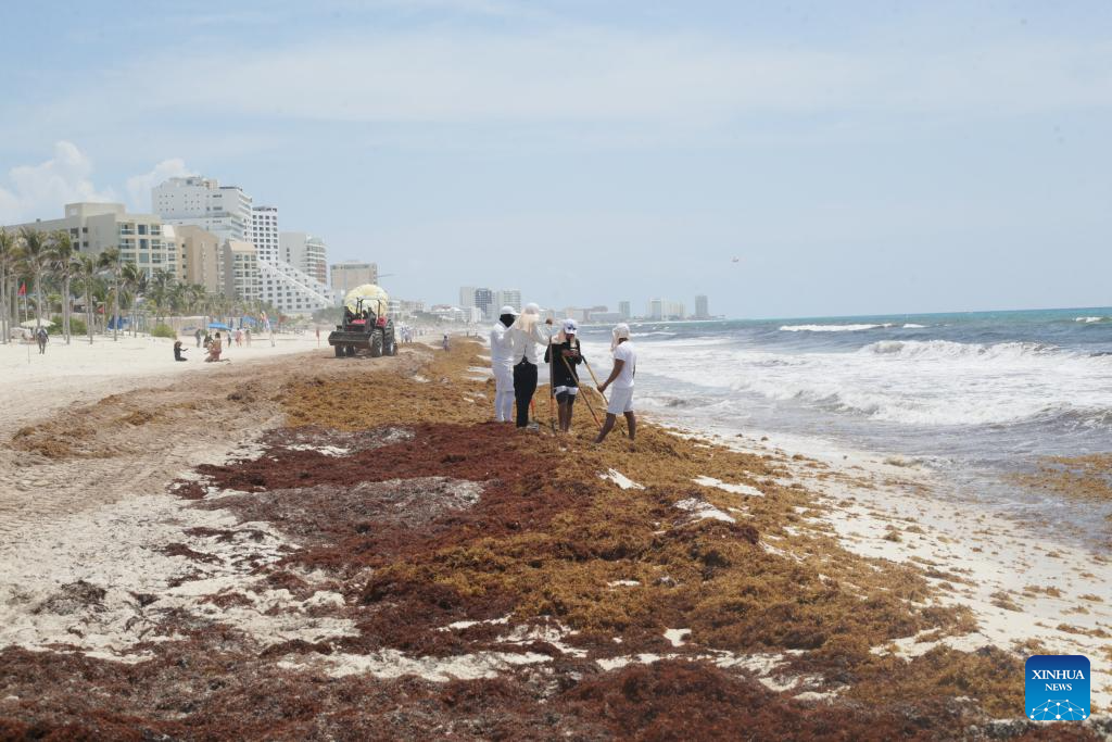 CANCUN, 15 julio, 2025 (Xinhua) -- Imagen del 14 de julio de 2025 de trabajadores retirando el sargazo en una playa, en Cancún, estado de Quintana Roo, México. (Xinhua/Rodolfo Flores)