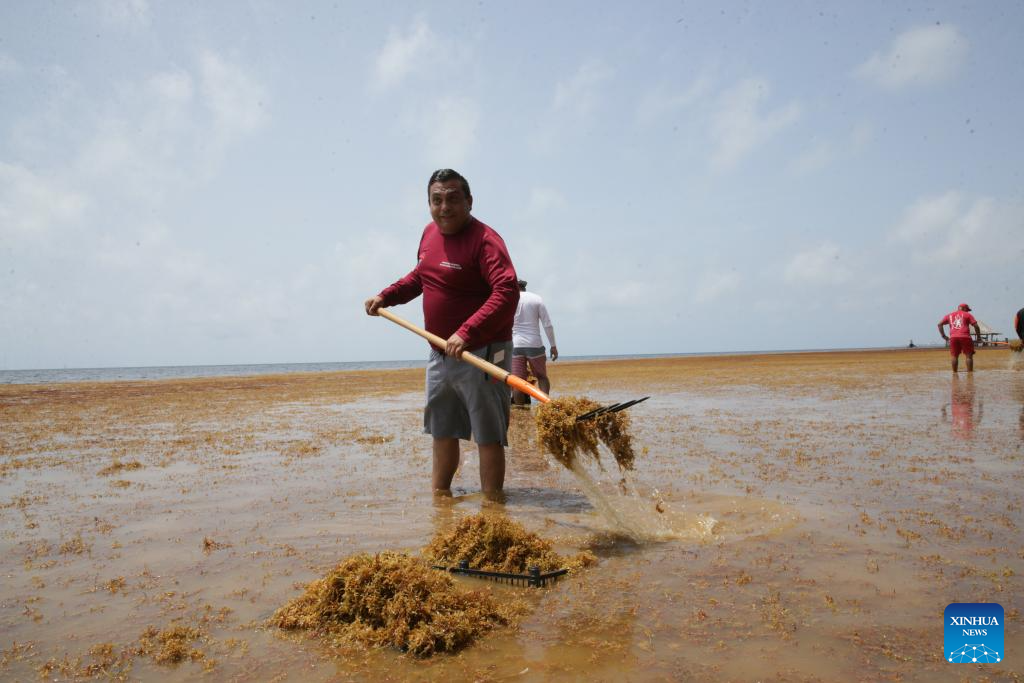 CANCUN, 15 julio, 2025 (Xinhua) -- Imagen del 14 de julio de 2025 de un hombre retirando el sargazo en una playa, en Cancún, estado de Quintana Roo, México. (Xinhua/Rodolfo Flores)