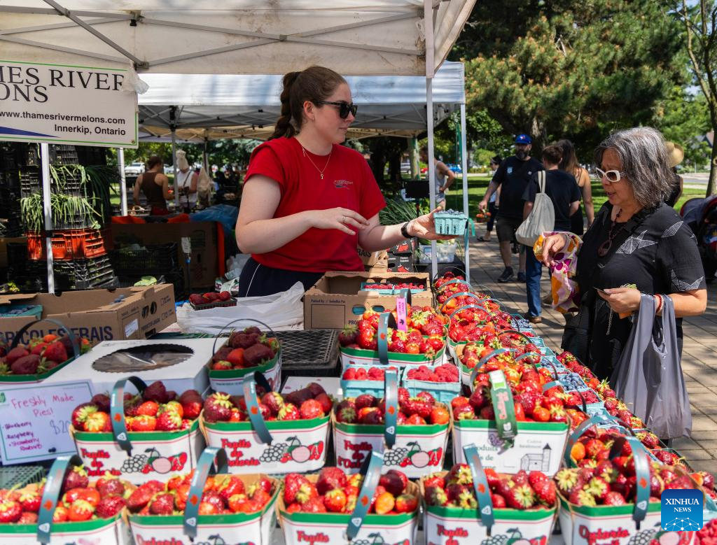 TORONTO, 15 julio, 2025 (Xinhua) -- Una clienta compra fruta en un mercado de agricultores, en Toronto, Canadá, el 15 de julio de 2025. El Índice de Precios al Consumidor de Canadá aumentó un 1,9 por ciento interanual en junio, frente al aumento de 1,7 por ciento de mayo, informó el martes Statistics Canada. (Xinhua/Zou Zheng)