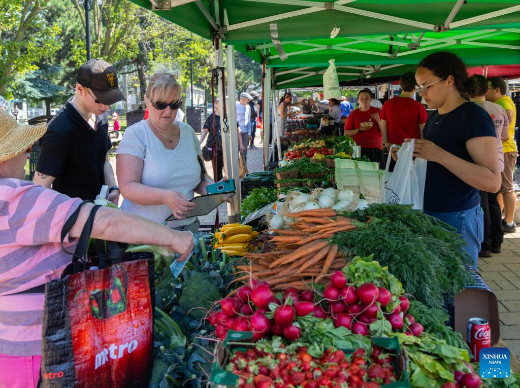 TORONTO, 15 julio, 2025 (Xinhua) -- Clientes compran comestibles en un mercado de agricultores, en Toronto, Canadá, el 15 de julio de 2025. El Índice de Precios al Consumidor de Canadá aumentó un 1,9 por ciento interanual en junio, frente al aumento de 1,7 por ciento de mayo, informó el martes Statistics Canada. (Xinhua/Zou Zheng)