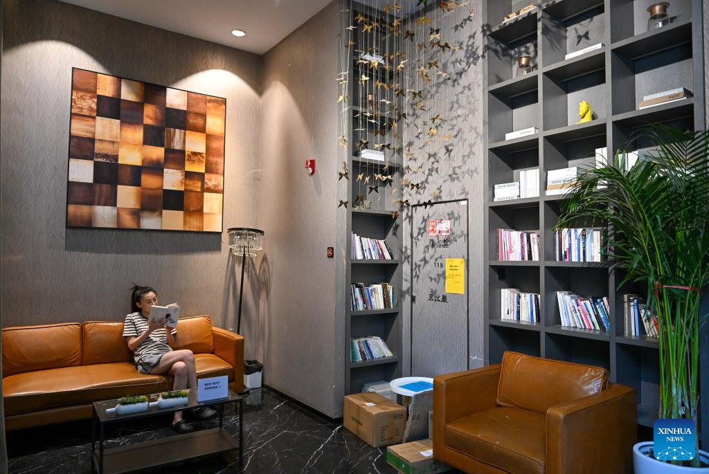 TIANJIN, 16 julio, 2025 (Xinhua) -- Imagen del 15 de julio de 2025 de una mujer leyendo en el espacio público de un edificio de apartamentos para talentos, en el distrito de Hedong de Tianjin, en el norte de China. El distrito de Hedong de Tianjin ha construido un conjunto de apartamentos para talentos con el fin de atraer y retener a jóvenes bien educados, tan necesarios para el desarrollo local. (Xinhua/Sun Fanyue)