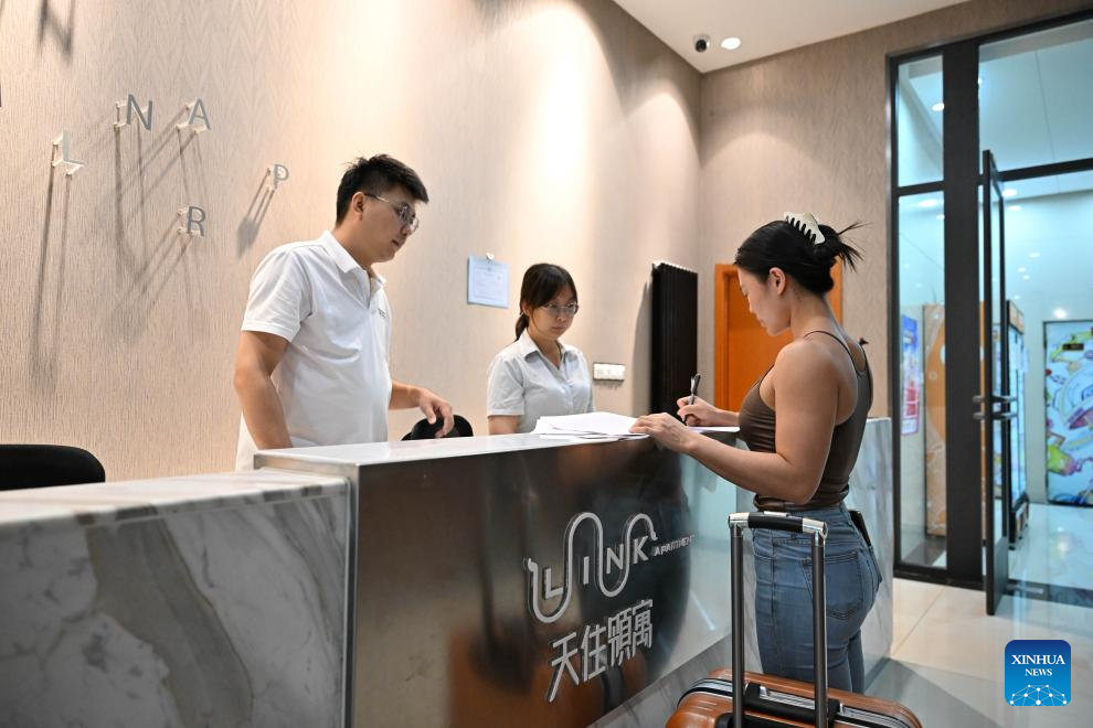 TIANJIN, 16 julio, 2025 (Xinhua) -- Imagen del 15 de julio de 2025 de una mujer registrándose en un edificio de apartamentos para talentos, en el distrito de Hedong de Tianjin, en el norte de China. El distrito de Hedong de Tianjin ha construido un conjunto de apartamentos para talentos con el fin de atraer y retener a jóvenes bien educados, tan necesarios para el desarrollo local. (Xinhua/Sun Fanyue)