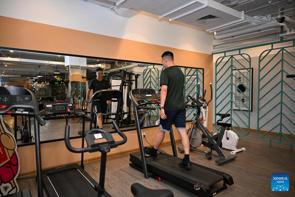 TIANJIN, 16 julio, 2025 (Xinhua) -- Imagen del 15 de julio de 2025 de un hombre ejercitándose en el gimnasio compartido de un edificio de apartamentos para talentos, en el distrito de Hedong de Tianjin, en el norte de China. El distrito de Hedong de Tianjin ha construido un conjunto de apartamentos para talentos con el fin de atraer y retener a jóvenes bien educados, tan necesarios para el desarrollo local. (Xinhua/Sun Fanyue)