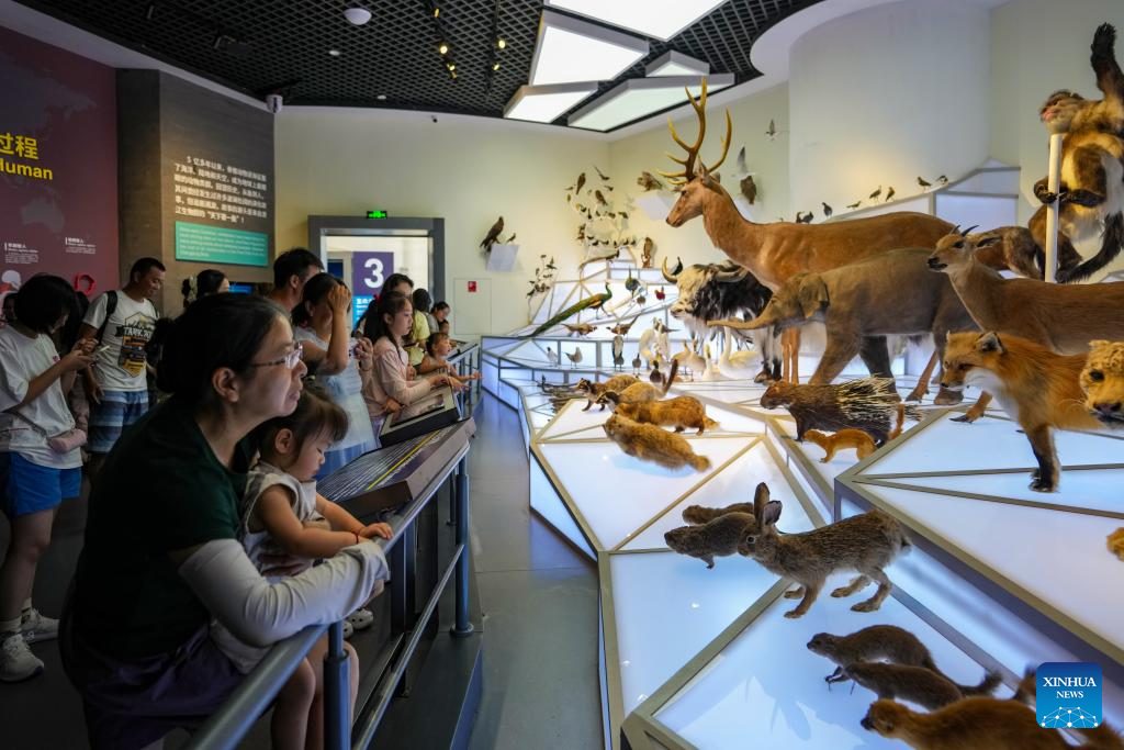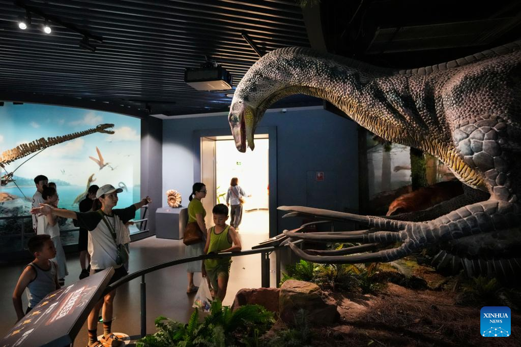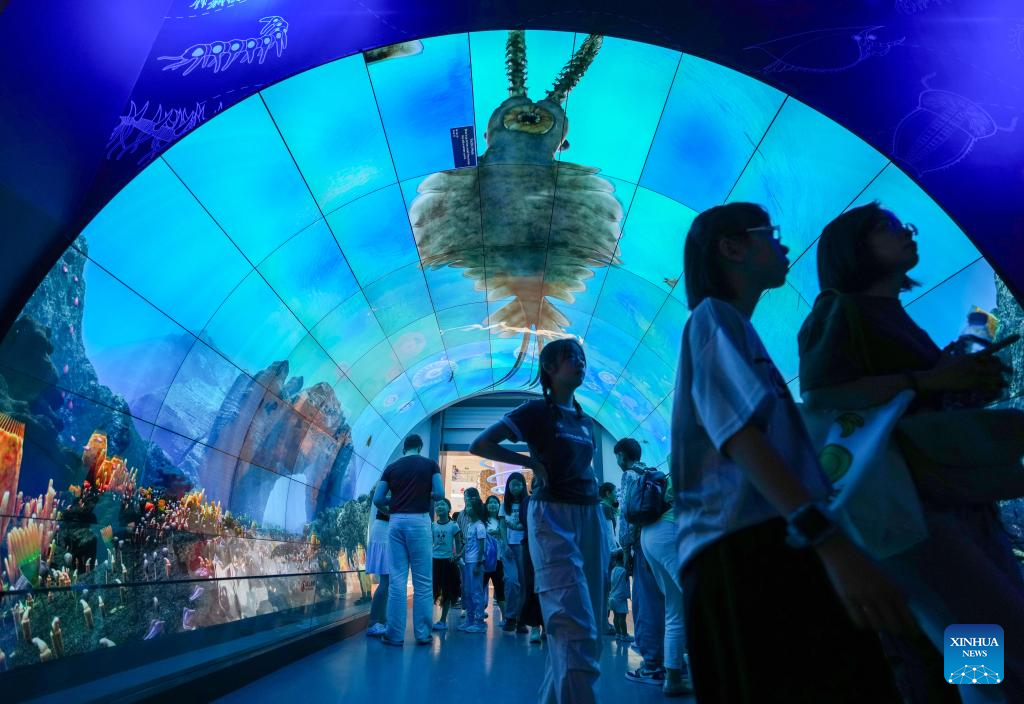 CHENGJIANG, 16 julio, 2025 (Xinhua) -- Imagen del 15 de julio de 2025 de visitantes observando especímenes de animales en el museo del patrimonio natural mundial del sitio de Fósiles de Chengjiang, en el distrito de Chengjiang, en la provincia de Yunnan, en el suroeste de China. Este museo, el primero de su tipo construido en un sitio de fósiles en el país, ha sido testigo de un aumento en las visitas y viajes de estudio desde el comienzo de las vacaciones de verano. (Xinhua/Chen Xinbo)