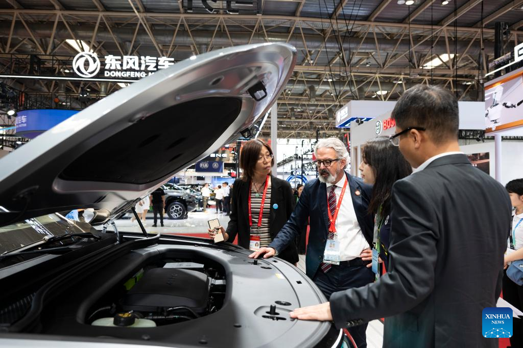 BEIJING, 16 julio, 2025 (Xinhua) -- Personas observan la carrocería de un vehículo de nueva energía exhibido en el área de la Cadena de Manufactura Avanzada durante la III Exposición Internacional de la Cadena de Suministro de China (CISCE, por sus siglas en inglés), en Beijing, capital de China, el 16 de julio de 2025. Con el tema "Conectar el Mundo para un Futuro Compartido", la exposición, organizada por el Consejo Chino para la Promoción del Comercio Internacional, se inauguró el miércoles en Beijing. (Xinhua/Ju Huanzong)
