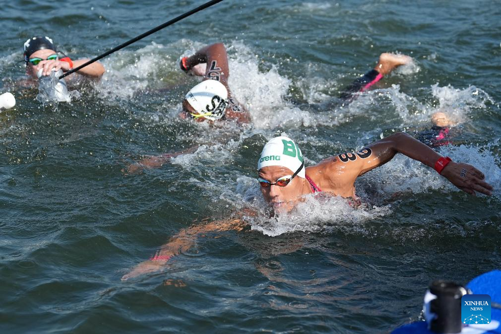 SINGAPUR, 18 julio, 2025 (Xinhua) -- Percy Escobar (abajo), de Bolivia, compite durante la final de 5 kilómetros masculinos de aguas abiertas en el Campeonato Mundial de Deportes Acuáticos 2025, en Singapur, el 18 de julio de 2025. (Xinhua/Xue Yuge)