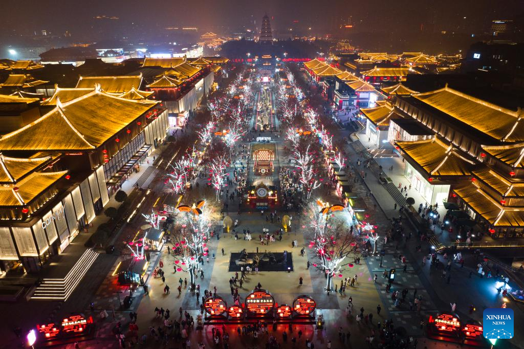 XI'AN, 18 julio, 2025 (Xinhua) -- Vista aérea tomada con un dron el 22 de enero de 2025 de personas visitando la Gran Ciudad Siempre Brillante de la Dinastía Tang, una popular atracción turística, en Xi'an, en la provincia de Shaanxi, en el noroeste de China. En los últimos años, Xi'an ha impulsado la renovación y el desarrollo de sus calles comerciales en coordinación con la protección de sus sitios históricos y culturales. Diversos programas de renovación urbana de alta calidad han inyectado nueva vitalidad en esta ciudad milenaria. (Xinhua/Shao Rui)