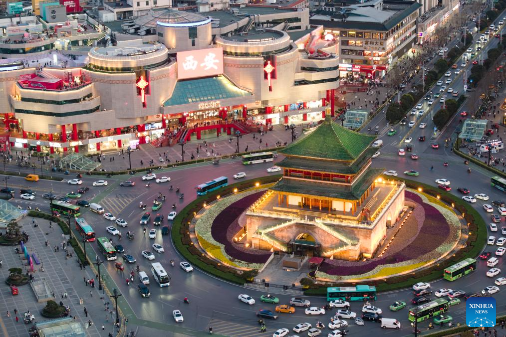 XI'AN, 18 julio, 2025 (Xinhua) -- Vista aérea tomada con un dron el 19 de marzo de 2025 de la Torre de la Campana, en Xi'an, en la provincia de Shaanxi, en el noroeste de China. En los últimos años, Xi'an ha impulsado la renovación y el desarrollo de sus calles comerciales en coordinación con la protección de sus sitios históricos y culturales. Diversos programas de renovación urbana de alta calidad han inyectado nueva vitalidad en esta ciudad milenaria. (Xinhua/Shao Rui)