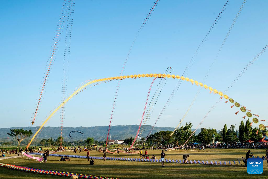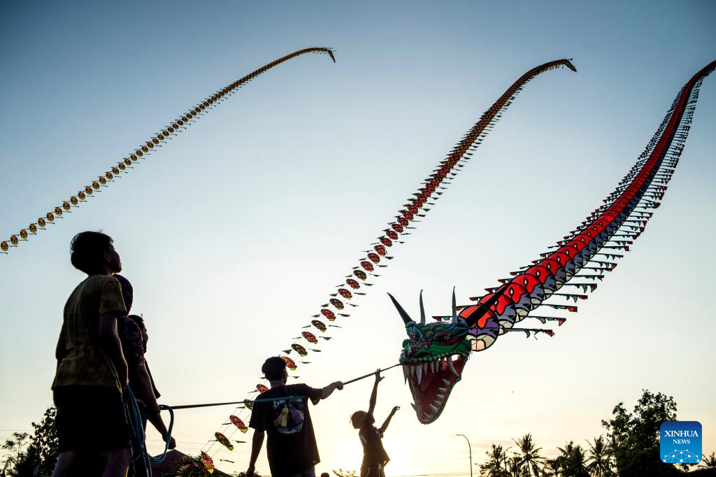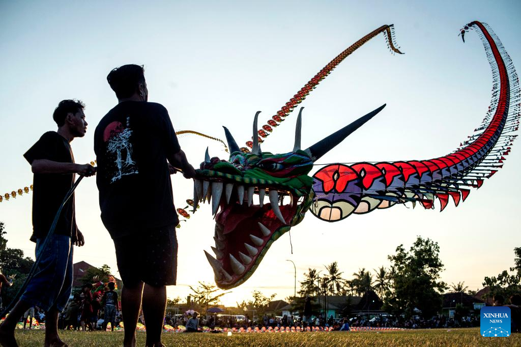 YOGYAKARTA, 18 julio, 2025 (Xinhua) -- Personas vuelan cometas de dragón, en Kebonagung de la regencia de Bantul, en Yogyakarta, Indonesia, el 18 de julio de 2025. (Xinhua/Agung Supriyanto)