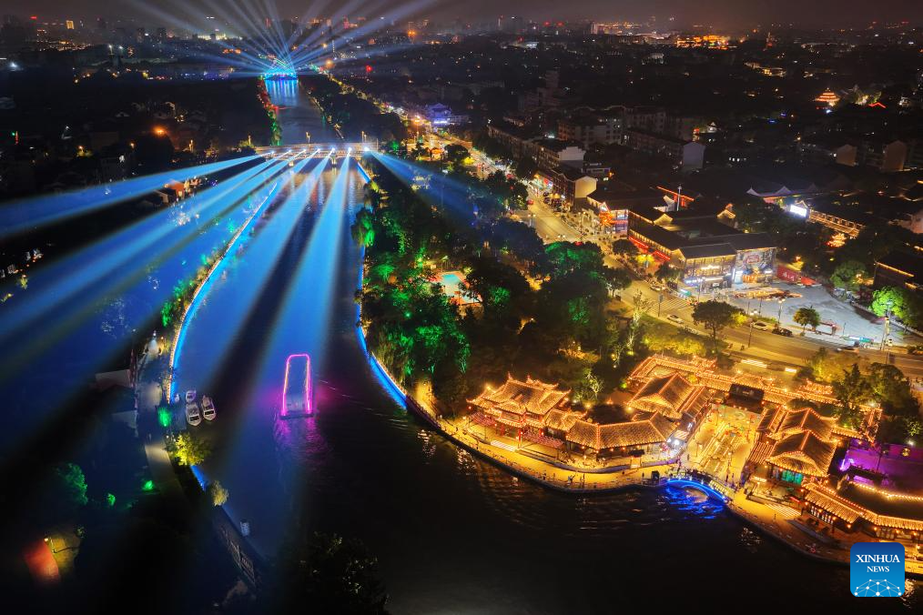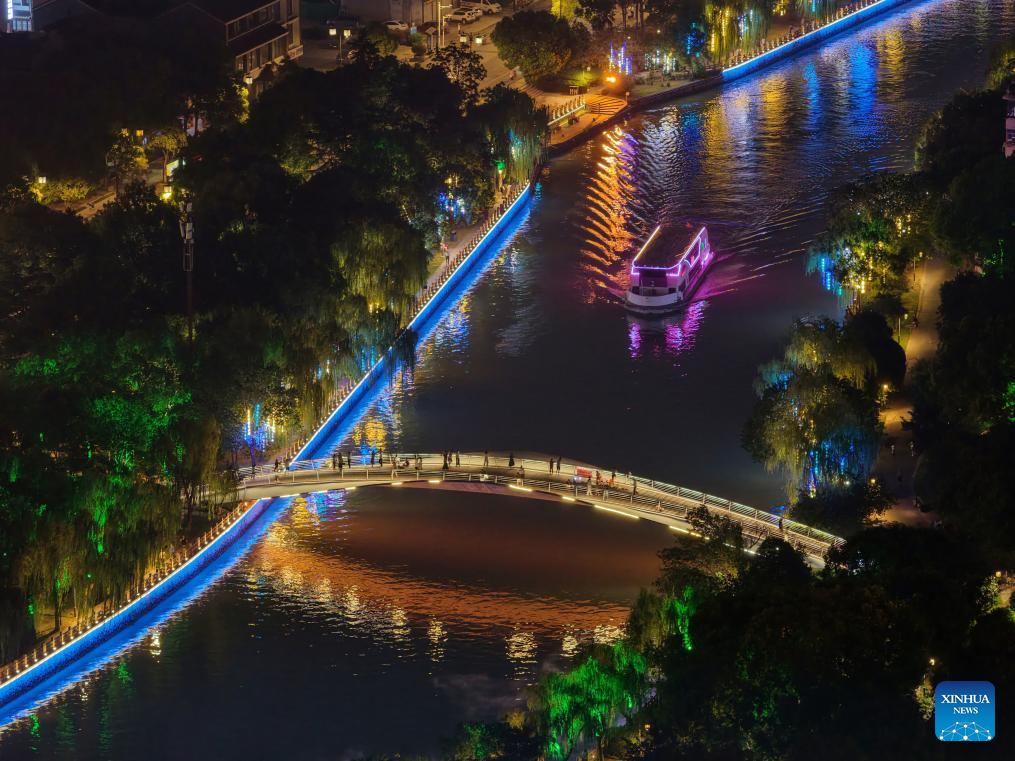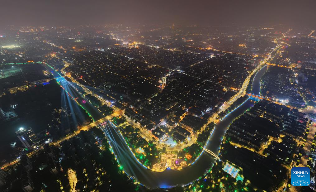 YANGZHOU, 18 julio, 2025 (Xinhua) -- Vista aérea tomada con un dron el 17 de julio de 2025 de una vista nocturna del antiguo canal, en Yangzhou, en la provincia de Jiangsu, en el este de China. En los últimos años, Yangzhou ha puesto en marcha un proyecto de mejora del paisaje nocturno del antiguo canal, y ha organizado visitas nocturnas y mercados nocturnos para mejorar la experiencia de consumo de los turistas. (Xinhua/Meng Delong)