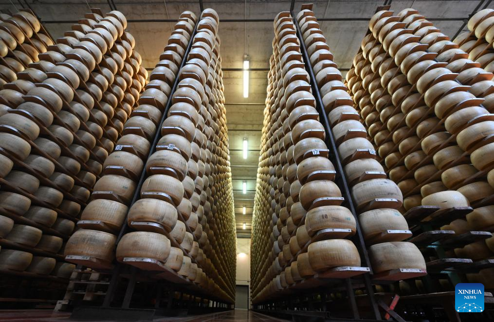 PARMA, 18 julio, 2025 (Xinhua) -- Imagen del 17 de julio de 2025 de ruedas de queso Parmigiano Reggiano vistas en la quesería Caseificio San Bernardino, en Tortiano, Parma, Italia. El famoso queso Parmigiano Reggiano de Italia se elabora con leche de vaca y se produce exclusivamente en algunas regiones del norte de Italia. (Xinhua/Alberto Lingria)