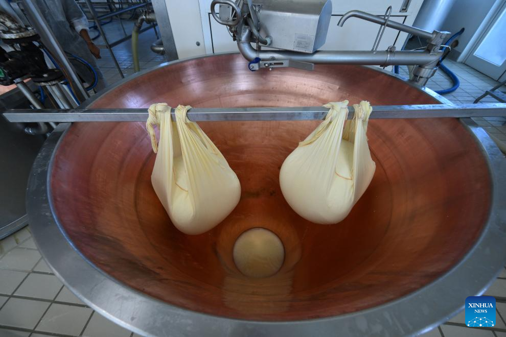 PARMA, 18 julio, 2025 (Xinhua) -- Imagen del 17 de julio de 2025 de trabajadores de la quesería Caseificio San Bernardino utilizando una tela de lino para levantar los gránulos de queso de una tina de cobre durante la producción de Parmigiano Reggiano en Caseificio San Bernardino, en Tortiano, Parma, Italia. El famoso queso Parmigiano Reggiano de Italia se elabora con leche de vaca y se produce exclusivamente en algunas regiones del norte de Italia. (Xinhua/Alberto Lingria)