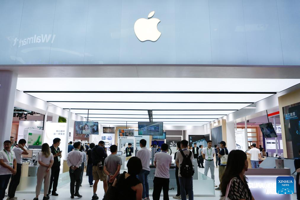 BEIJING, 18 julio, 2025 (Xinhua) -- Imagen del 17 de julio de 2025 del estand de Apple durante la III Exposición Internacional de la Cadena de Suministro de China (CISCE, por sus siglas en inglés), en Beijing, capital de China. Con el tema "Conectar el mundo para un futuro compartido", la CISCE 2025 se celebra del 16 al 20 de julio, reuniendo a más de 650 empresas e instituciones de 75 países, regiones y organizaciones internacionales. Los expositores extranjeros representaron el 32 por ciento del total, es decir 3 puntos porcentuales más que en la edición anterior. En el evento de este año también han participado más de 170 delegaciones de visitantes extranjeros, y más de 230 expositores han acudido por primera vez. (Xinhua/Ding Hongfa)
