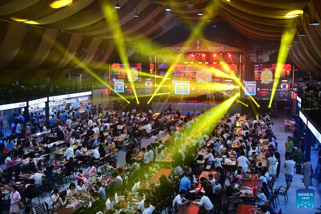 QINGDAO, 18 julio, 2025 (Xinhua) -- Personas asisten al 35° Festival Internacional de la Cerveza de Qingdao, en la Nueva Area de Xihai'an (Costa Oeste), en Qingdao, en la provincia de Shandong, en el este de China, el 18 de julio de 2025. El festival de 30 días de duración comenzó aquí el viernes, reuniendo a más de 2.300 marcas de cerveza nacionales y extranjeras. El festival también incluye una serie de actividades, como desfiles artísticos, concurso de cerveza artesanal, conciertos, concurso del Rey de la Cerveza, carnaval de animación y festival deportivo de moda. (Xinhua/Li Ziheng)